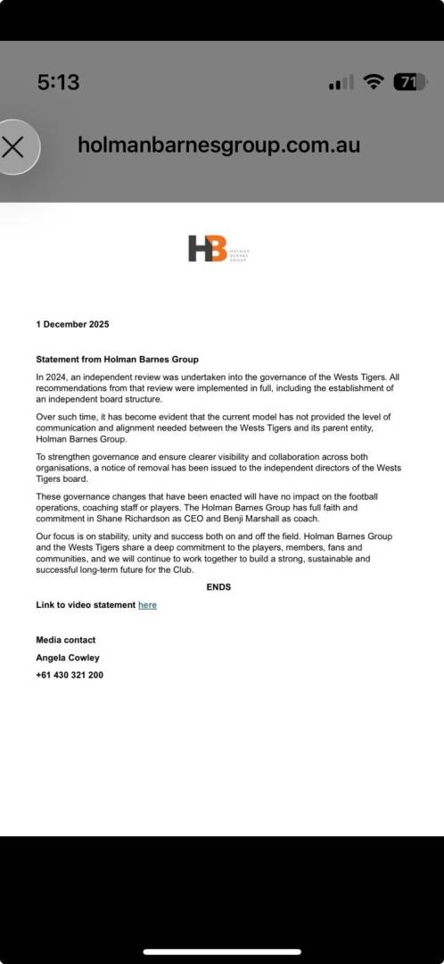 “In 2024, an independent review was undertaken into the governance of the Wests Tigers. All recommendations from that review were implemented in full, including the establishment of an independent board structure,” the Holman Barnes Group said in a statement.