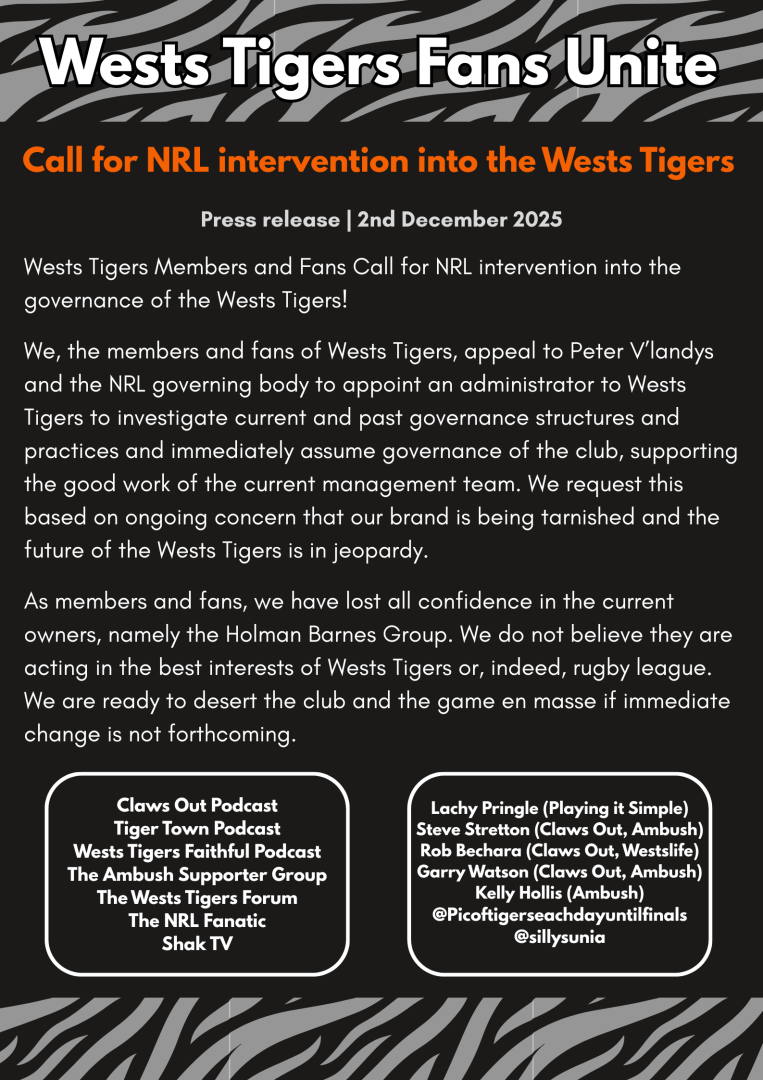 Hey everyone, we need a united front requesting the NRL to step in and appoint an administrator to govern Wests Tigers. Copy and paste the below message, or send your own to the NRL: